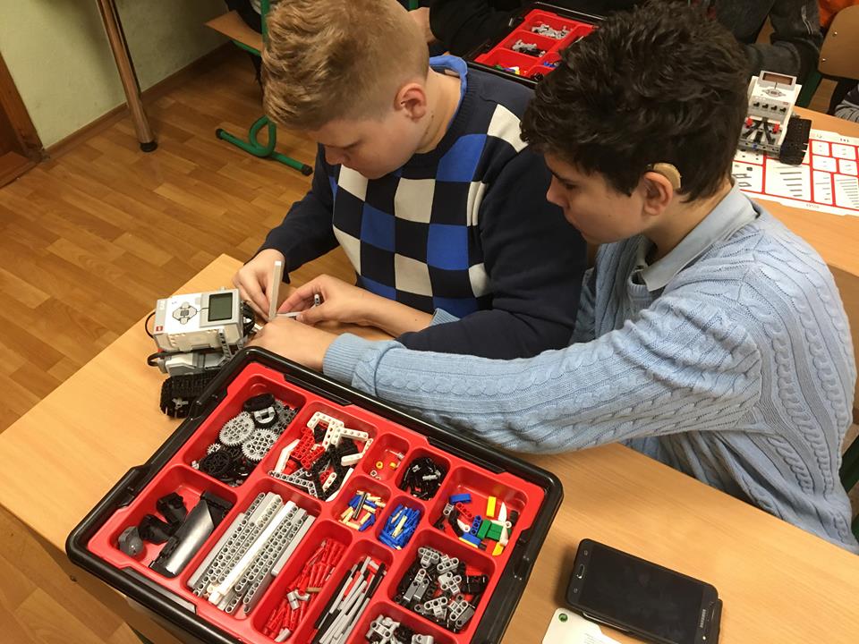 Перша зустріч відбулася в гімназії. 16 учнів НРЦ «Країна добра» завітали в гості та випробували свої можливості у складанні робота. У гімназії для них провели невеличку екскурсію, показали кабінет робототехніки, розповіли про напрямки роботи із «Лего» та роботами, зокрема продемонстрували й напрямок Лего-архітектури. Потім діти самостійно за власним творчим баченням мали скласти робота. Гімназисти ж виступали під час цієї діяльності консультантами та підказували, що потрібно зробити, в разі такої потреби. Мали нагоду діти із особливими потребами й позмагатися на вже запрограмованих роботах у сумо – коли один робот має виштовхнути іншого з кола. Діти були у захваті від такої цікавої та нестандартної діяльності.