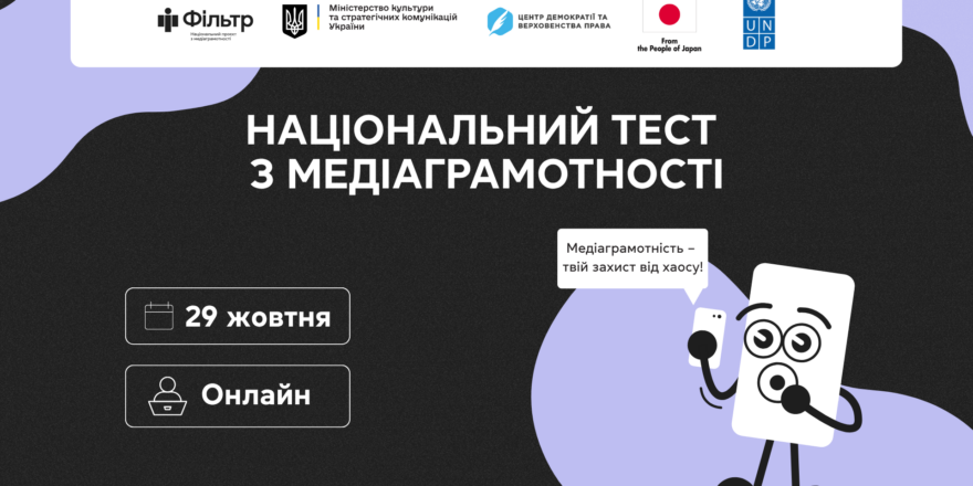 Національний тест із медіаграмотності реалізує національний проєкт із медіаграмотності «Фільтр» Міністерства культури та стратегічних комунікацій України в партнерстві із Центром демократії та верховенства права за підтримки UNDP Ukraine / ПРООН в Україні та фінансування уряду Японії.