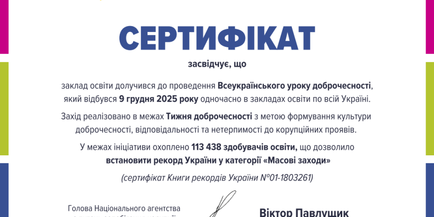 Гімназію відзначено сертифікатом за долучення до Всеукраїнського уроку доброчесності та рекорду України